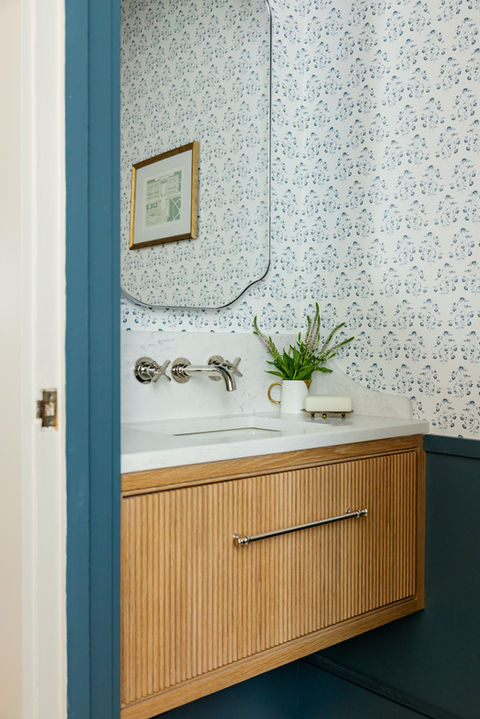 Light-filled and highly functional, the redesigned mudroom, laundry, and powder room bring together everyday utility and refined design in this historic 1920s colonial home. Clean lines, ample storage, and wallpapered accents add character and warmth, while the powder room introduces a serene and elegant touch. Thoughtfully planned for a modern family of four, cohesive blues, greens, warm woods, and brass details tie everything together, creating spaces that are both welcoming and polished.