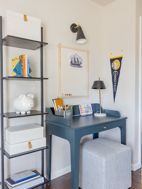 As we do in all kid spaces, we added a desk so he could be creative without little brothers bugging him. A place where he could color and draw and also grow into—a place to do homework.